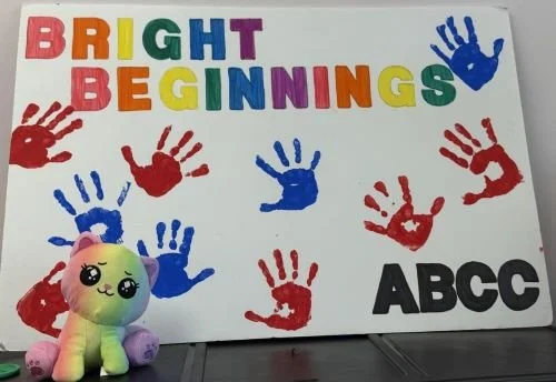 Poster with hand prints at Bright Beginnings.
