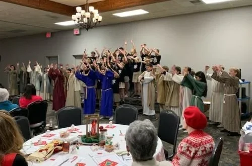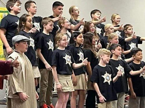 The Holy Family School fifth & sixth graders performed their musical, “Arrest These Merry Gentlemen,” Tuesday, December 17, 2025 for the Pilot Club. Synopsis: Think of this Christmas title as “Bethlehem meets Dragnet.” It is a “caper” featuring Bethlehem Peace Officer Joe Sabbath investigating an alleged gang of joyfully-rowdy shepards “disturbing the peace” with crazy story about angels & a mysterious baby.